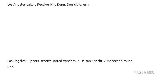 所以媒体FW支招洛杉矶双雄,可以寻求商讨交易,从省流的方式来说,就是湖人追求两工兵邓恩和小德里克-琼斯。快船则吞下负资产,也就是范德比尔特溢价合同,顺便拿到克内克特和一个2032年次轮签作为补偿。