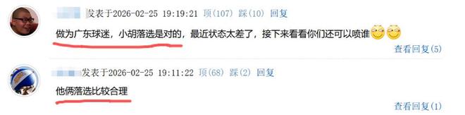 出征的14人当中,胡明轩、赵嘉义两人最终落选。对此,球迷直言:“作为广东球迷,小胡落选是对的”、“他俩落选比较合理”