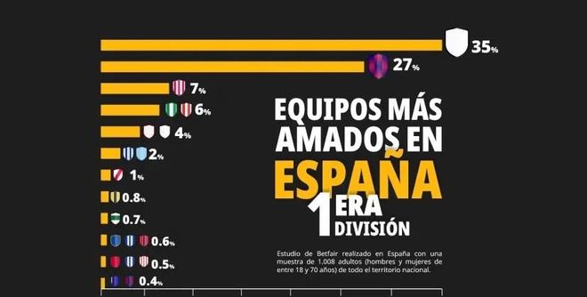 其他球队方面,马竞以7%的支持率位居第三,紧随其后的是贝蒂斯和毕尔巴鄂竞技(均为6%),瓦伦西亚与塞维利亚则各获4%。