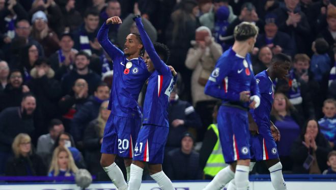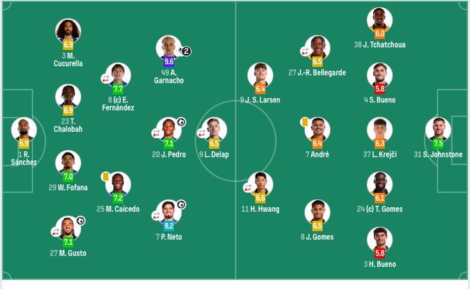 切尔西首发:1-桑切斯、27-古斯托(77’24-詹姆斯)、29-福法纳、23-查洛巴、3-库库雷利亚、25-凯塞多、8-恩佐(83’11-吉滕斯)、7-内托(77’38-吉乌)、20-若昂·佩德罗(83’17-桑托斯)、49-加纳乔、9-德拉普(64’41-埃斯特旺)。